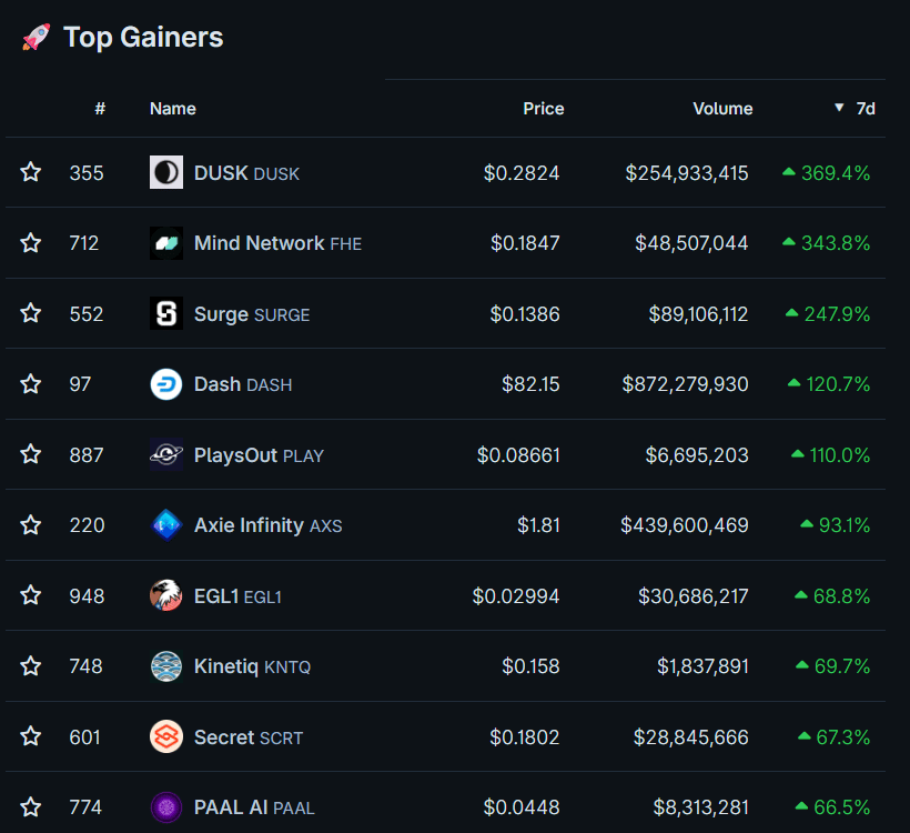 While the market bled red, privacy coins like Monero (XMR, which hides transaction details) hit all-time highs, up 9% in 24h, and DUSK surged 500% in the last 30 days.