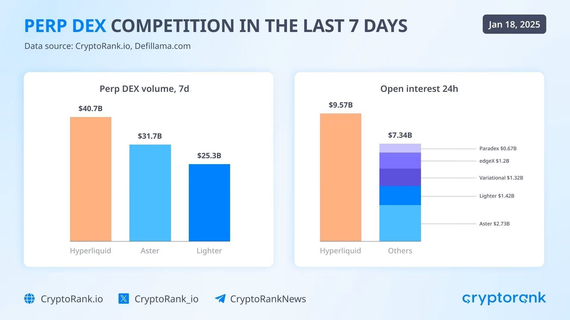 Hyperliquid, a DEX for perpetual futures, extended its lead with surging volumes while competitors dipped. Perps allow leveraged bets on crypto prices.