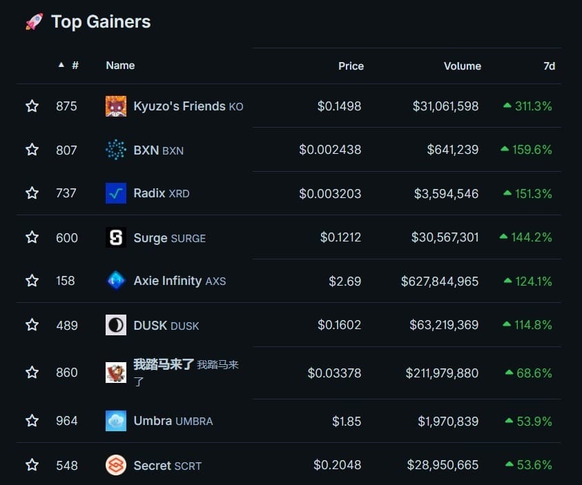 Top 10 Best Performing Tokens in the Last 7 Days:
