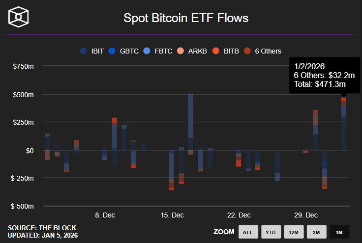 On January 2, U.S.-based spot Bitcoin ETFs saw $471.3 million in net inflows, while Ethereum ETFs attracted $174.5 million, totaling $646 million, the largest combined daily haul in weeks. This "January effect" follows $6 billion in outflows late 2025, attributed to tax-loss harvesting, and signals rebounding institutional demand.