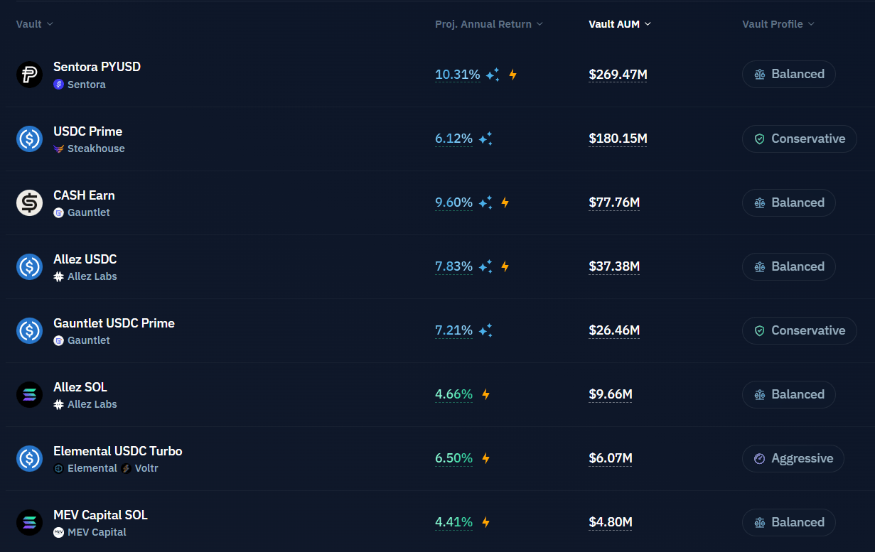 These vaults diversify across stablecoins, liquid staking tokens (LSTs, which allow staked SOL to remain usable while earning rewards), and tokenized real-world assets (RWAs, on-chain versions of traditional securities or credit).