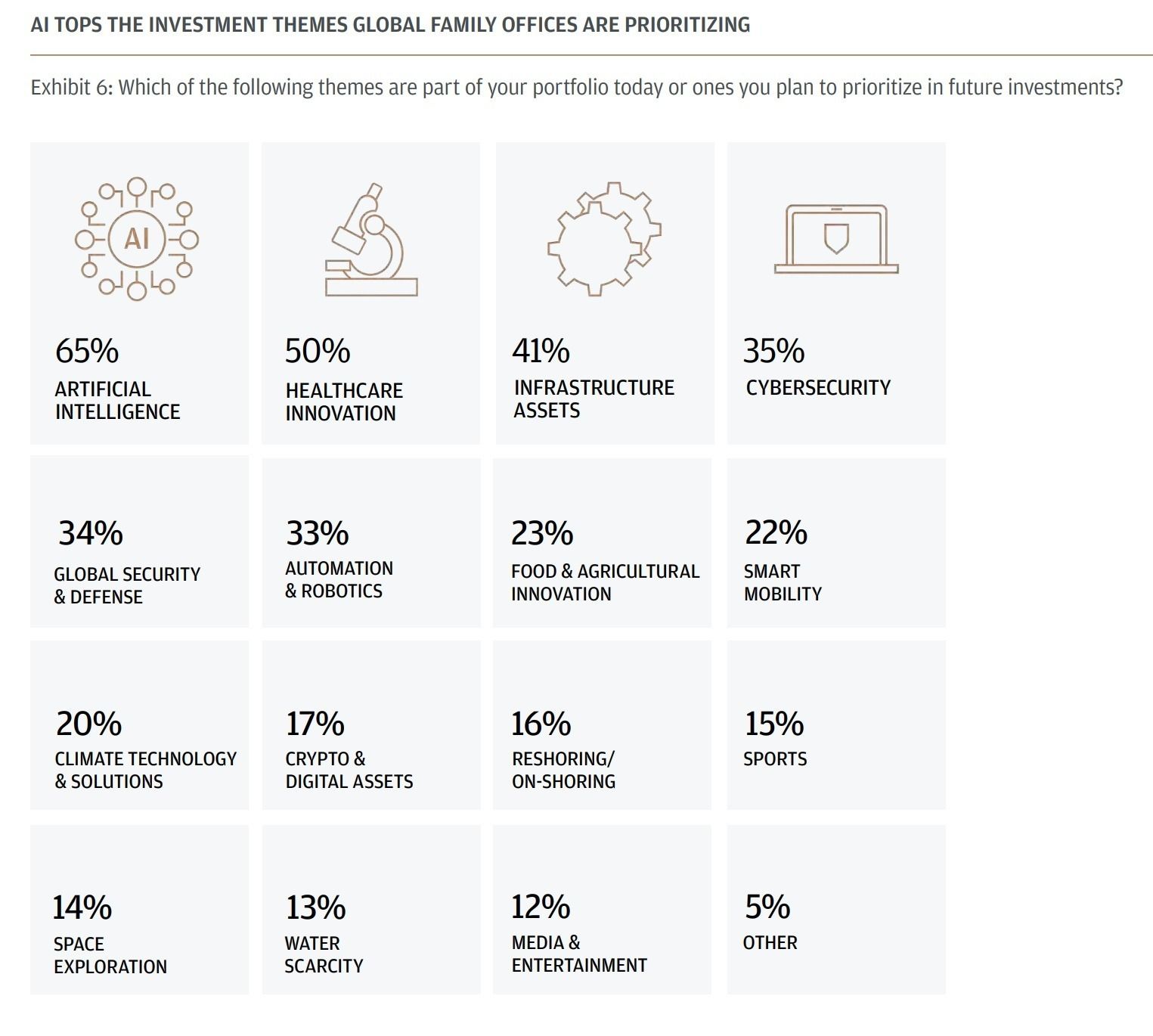 A recent JPMorgan report on global family offices, wealth management entities for ultra-high-net-worth families, reveals AI as the top investment theme for 2026, with 65% prioritizing it, far outpacing crypto at just 17%.